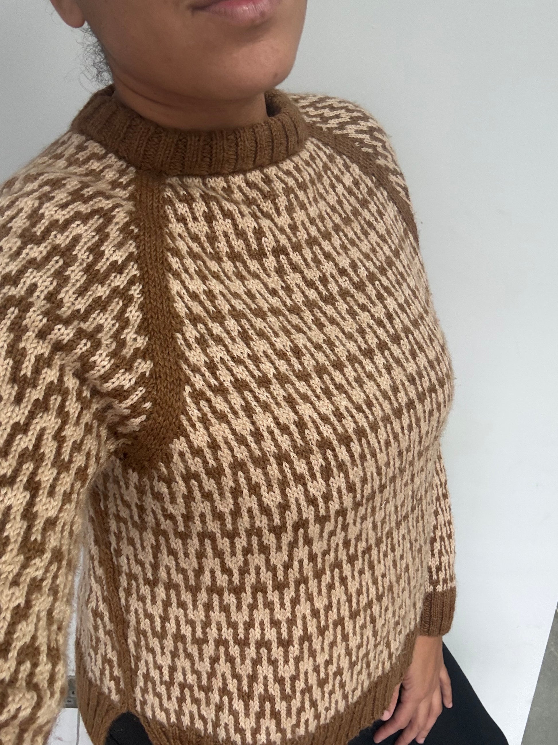 The Nkyinkyim (ZigZag) Sweater is an all over colourwork raglan designed with 10cm -15cm of positive ease, to give a slightly relaxed fit. The pattern begins at the neckline with ribbing for the collar. The colourwork chart and raglan increases are then worked until you have finished the yoke of the sweater. Next the sleeves are put on hold and the body is worked using the same pattern repeat. Work the remainder of the body of the sweater, finishing with a 2x2 ribbed split hem, to add length to the back of the sweater. The body is then finished with a 2x2 ribbed tubular bind off. Lastly, pick up the sleeve stitches and work the sleeves in pattern, with regular decreasing, until wrist length. Then start the 2x2 ribbed cuff, finishing the sleeves with a 2x2 tubular bind off.